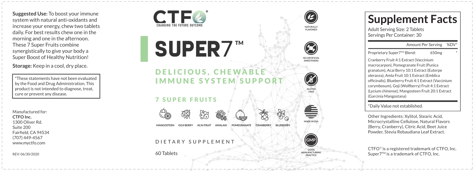 Super7 is a delicious blend of the world's 7 major Super Fruits; Amalaki, Acai, Goji, Mangosteen, Pomegranate, Blueberry and Cranberry. While providing vitamins, antioxidants, energy, enzymes and much more, CTFO has combined all 7 Super Fruits into a perfectly blended, synergistic immune support chewable.